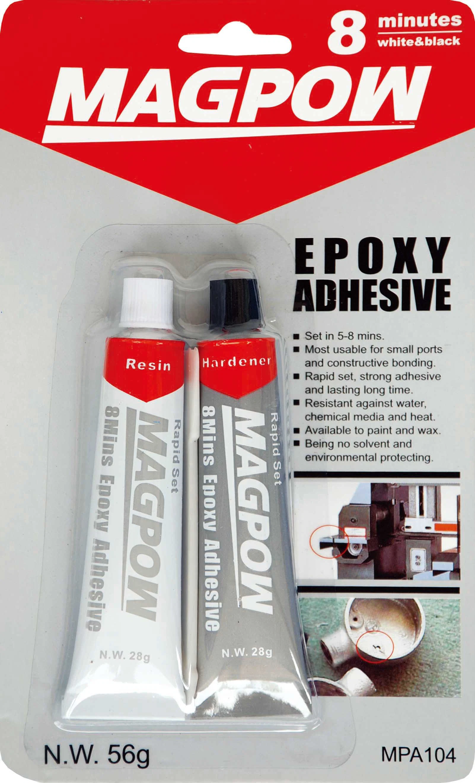 The products of this series are widely used for bonding all kinds of hard material, like iron, casting iron, steel, aluminum, glass, pottery, graphite, concrete etc. And they could be applied to bond and repair in the field of daily households, home appliance, machine implement for agriculture, machine facilities, apparatus, stationery, arts, furniture, tube of water, valves, chemical piping, water towers, dam, pipes of water power plant etc.