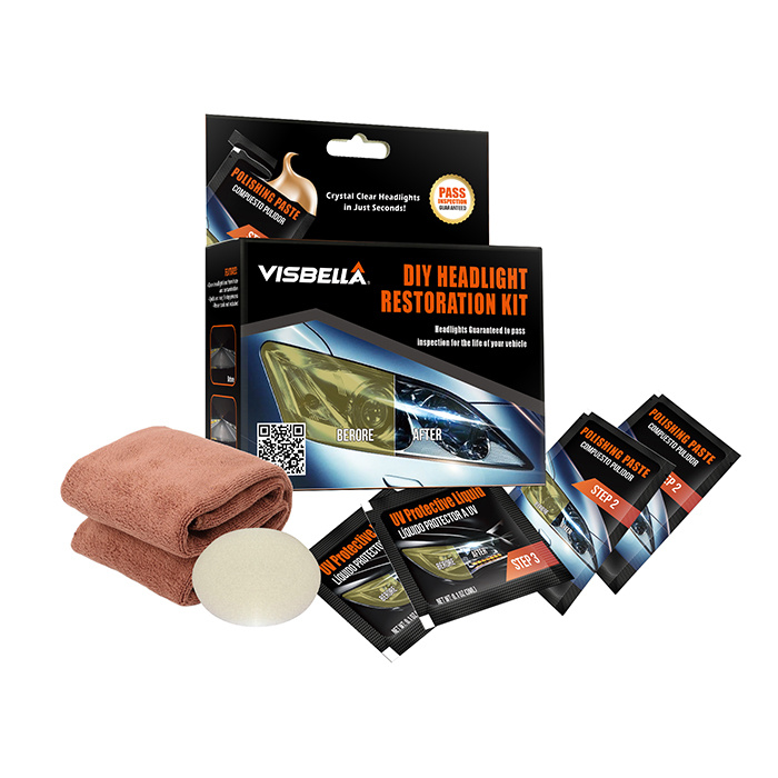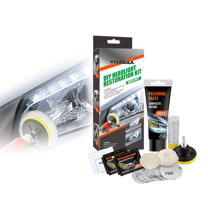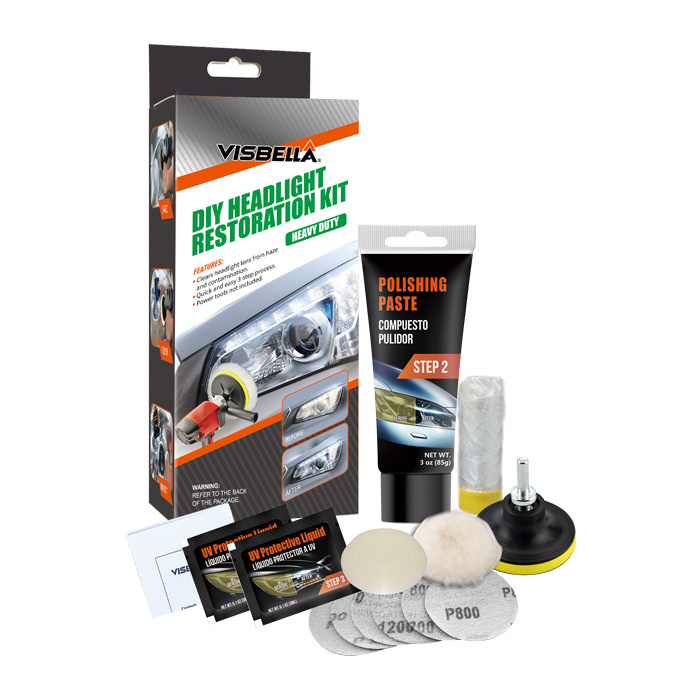 Visbella® Headlight Restoration Kit lets you shine and restore plastic lenses, including headlights,tail lights, fog and directional lights. By restoring clarity to the lens, the performance of the headlight is improved and the appearance of the vehicle is enhanced. Now you can produce professional results with the Headlight Restoration Kit. Kit includes all items necessary to perform the task.