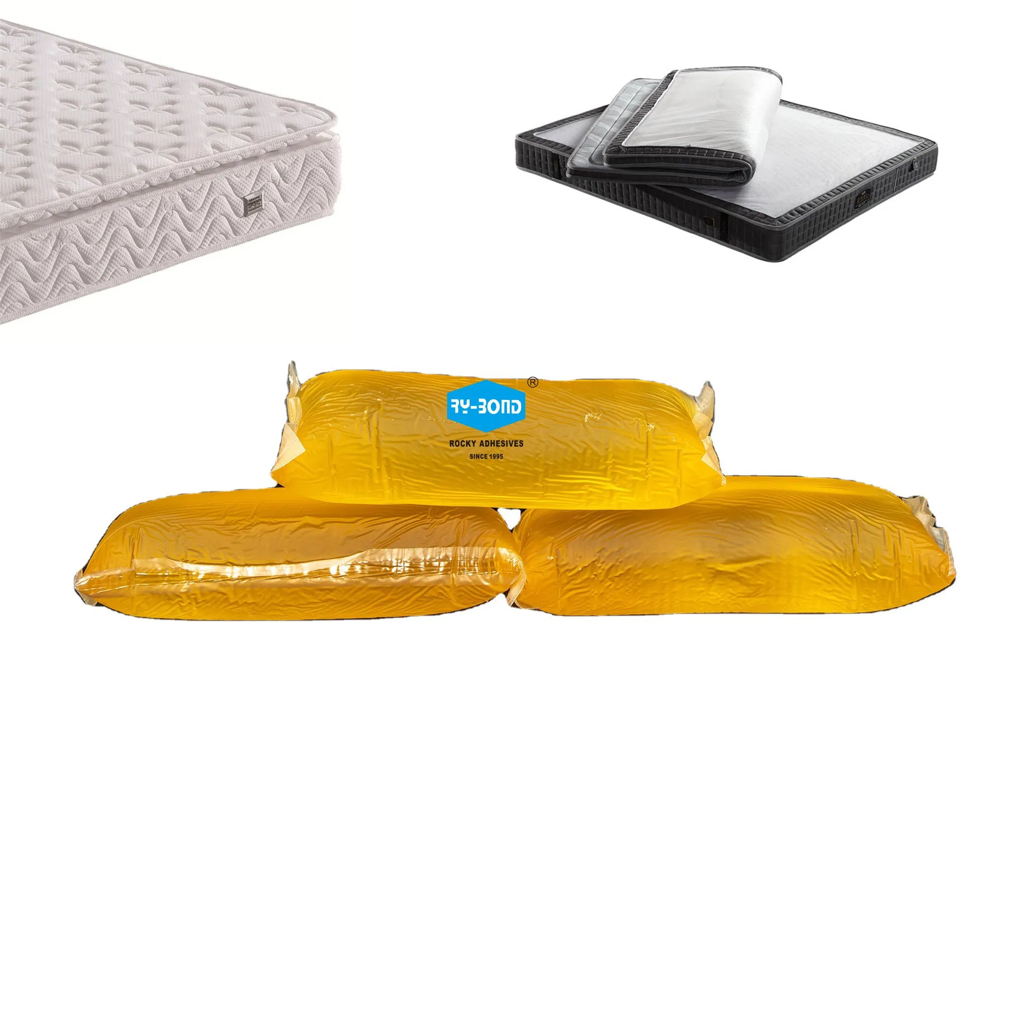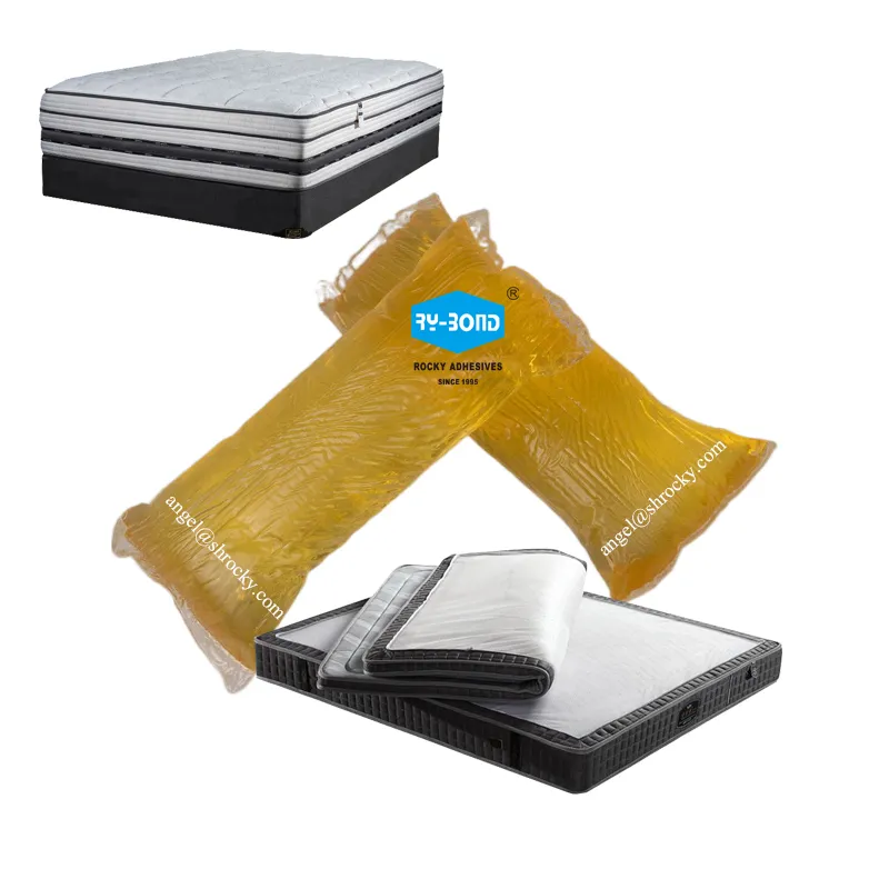 hot melt adhesive glue for bonding foam fabric mattress formingAPPLICATION Hot melt adhesive designed for form bonding in mattress and sofa indusry. For bonding spring pocket together in mattress forming. Product namemattress spring pocket hot melt glueBrandROCKY ADHESIVESMain raw material synthet......