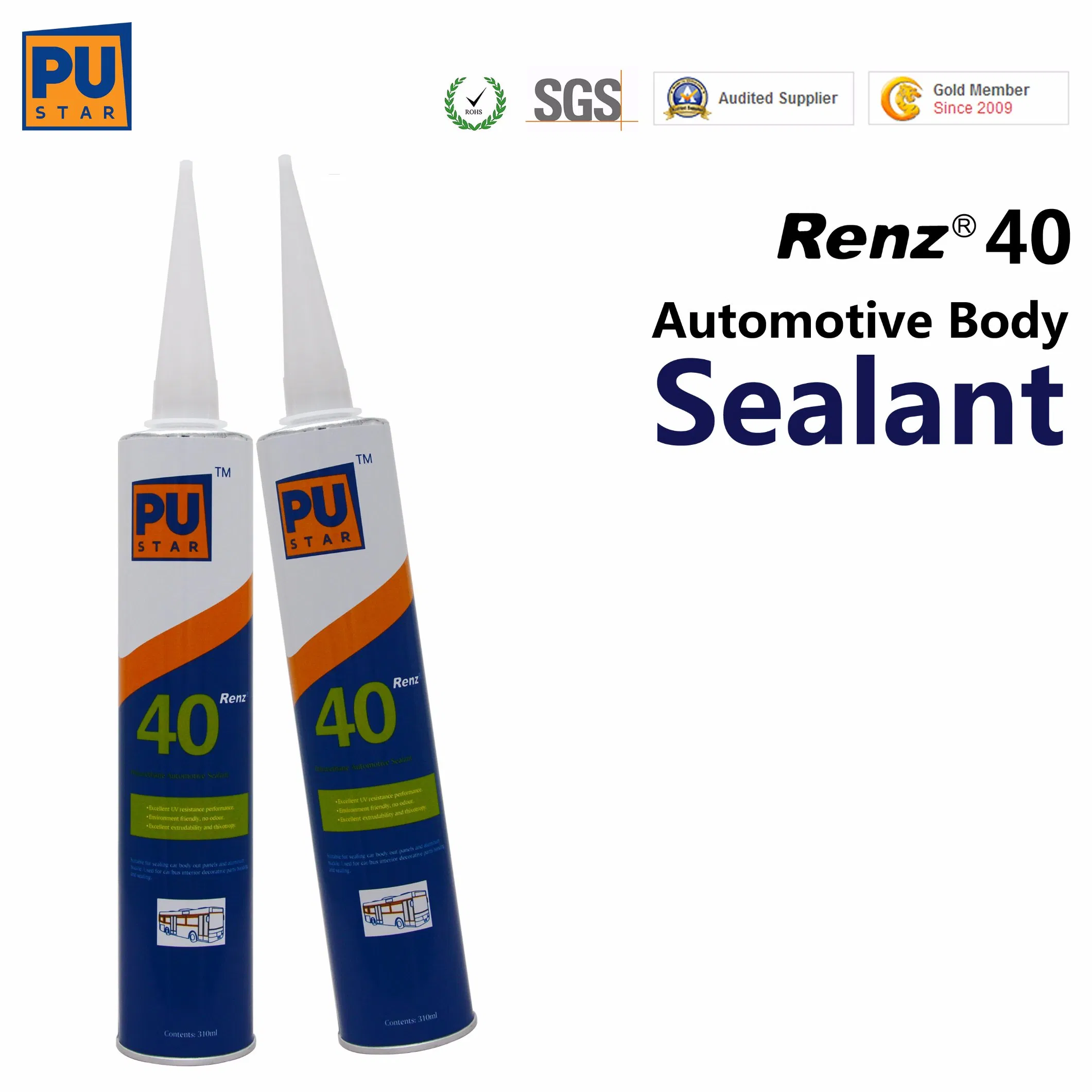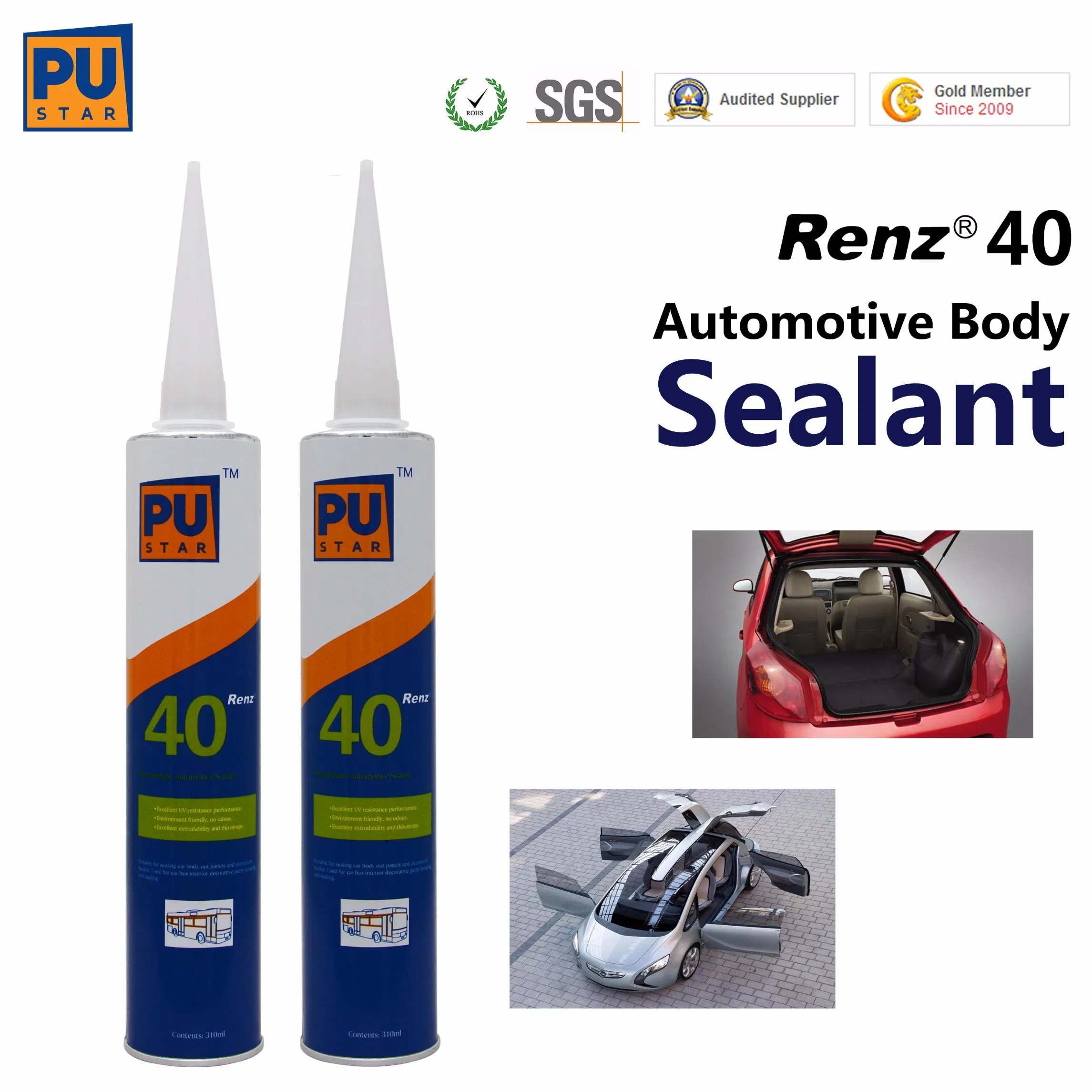 1.POLYURETHANE SEALANT Renz40Renz40 - 1-component moisture curing pu sealant for car body . It's water-proof age-resistance,solf and convenient for application. It normally used in car body such as car framework bonding. After curing, it provides a permanently elastic bond to fasten materials and all the sealant is paintable of all kind of color.No corrosion and pollution to substrates, environment friendly, no bubbles during application, smooth and fine appearance etc.
